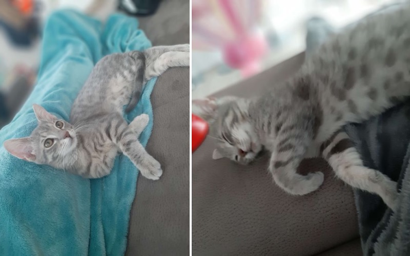 „Kedves Menedék! Bejelentkezem én is. Az öt tagú banda egy szem lánytagja lett a mi családunk tagja. Molly lett a becsületes neve. Igazi bújós és nagyon játékos cica. És csodaszép! Szerintünk van benne bengáli vér, bár nem értünk annyira a fajtákhoz. Pöttyös-csíkos kis bajkeverő!”