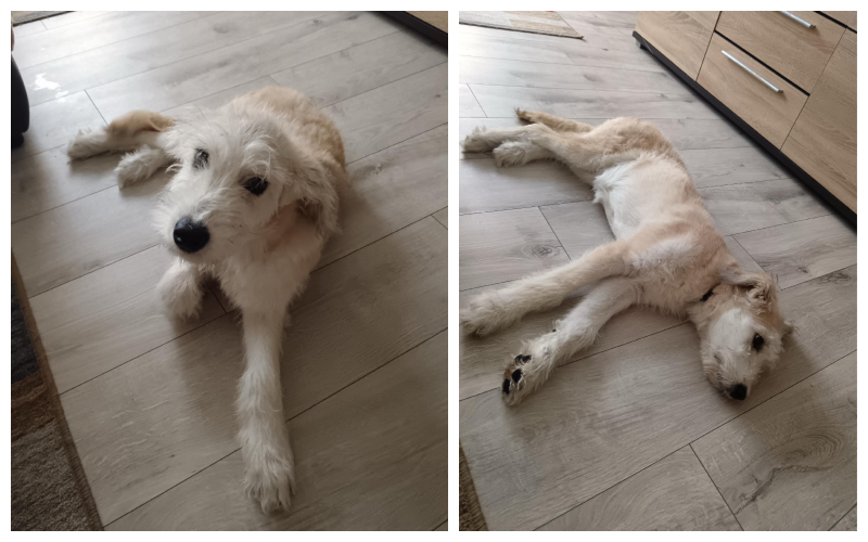🐾 Még nem teljesen szobatiszta, de az ajtóhoz ülve jelzi, ha ki szeretne menni