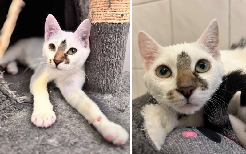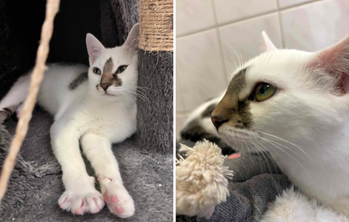 Smaragdra a Nap utca végén lévő bokros, szemetes zöldterületen találtak rá, egy kutyus a gazdájával sétált éppen arra, ők kértek segítséget tőlünk. Kezdetben idianyuja Puffogónak hívta, mert nagyon félt, fújt, karmolt, harapott. Később gyönyörű smaragdzöld szeméről kapta a Smaragd nevet. Valószínűleg az anyacica egy Nap utcai háznál hozta világra, a felelőtlen gazda pedig ivartalanítás helyett a nem kívánt szaporulatot kidobta. Idianyuja türelmes szelidítgetésének hála mára megszerette a simit, hízelegve dobja magát hanyatt hasisimiért, első mancsával felmászik és bújik az emberhez. Hirtelen zajoktól még megijed, de kizárólagos benti tartás mellett megszokja majd a porszívót is! Cicatársaival szívesen és sokat játszik. 13 hetes nőstény, chipes, parazitamentesített. Első oltását már megkapta, az almot ügyesen használja. Ivartalanítási kötelezettséggel, benti tartással fogadható örökbe! A poszt 2025 szeptemberében készült. Hivatkozási száma: 966. Érd: +36(70)365-80-96 (2025-10-03 19:22:42)