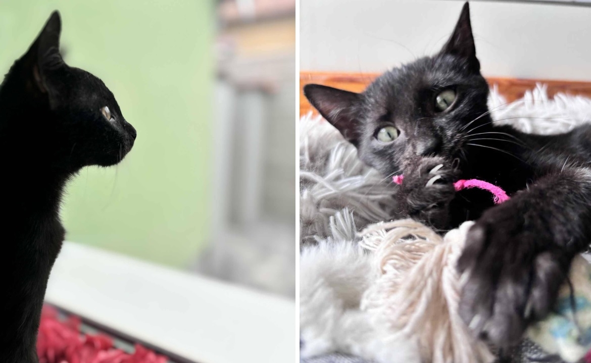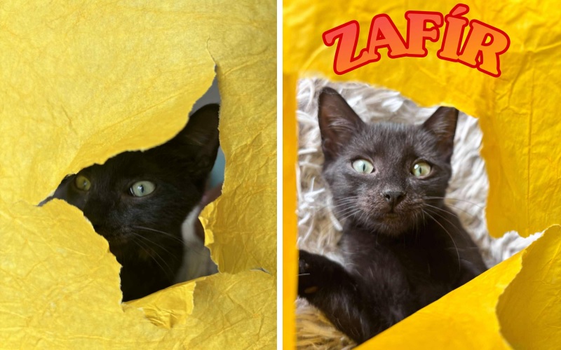 9 hetes nőstény, chipes, parazitamentesített, első oltását már megkapta. Nagyon játékos, kedves dorombológép, hízeleg, követeli a szeretgetést. Emberszerető, de cicapajtásaival is sokat játszik. Az almot ügyesen használja. Ivartalanítási kötelezettséggel, benti tartással fogadható örökbe.